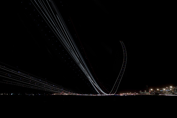 Drive-Thru Gallery owner Andrew Pielage is presenting a collection of eight nighttime photographs taken from Sky Harbor International Airport. Pielage, fascinated by the movement of different light sources throughout the dark, decided to capture planes’ trajectory with the use of long exposure photography. The results are beautiful, as brief bursts of airplane lights draw curves in the sky, and the lights of cars shoot thick lasers along our concrete wasteland.
